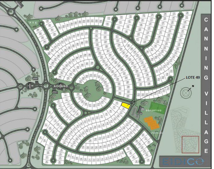 Barrio ubicado dentro del complejo "Canning Village" de 164 hectáreas, 660 lotes, 650 m2 promedio.