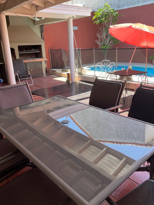 Excelente opción en BANFIELD OESTE, a metros de avenida URIARTE, Propiedad al frente sobre lote propio edificada con jardín al frente, muy buen ingreso de aire/luz, desde el Oeste, P.Baja: Living y sala de estar al frente pisos porcelanato y techos yeso proyectado moldurado perimetral, excelente gusto estetico y decoración, ventana bow window, porton automático rejas espacio para vehiculo de cortesía, Garage cerrado para dos vehiculos amplios con importante espacio de guardado extra y salida al fondo, toilette de recepción completo y amplio, Cocina completa con alto y bajo mesada, alacenas y bodega, bacha de lavar acero inoxidable doble primera marca, griferías de primera, puerta ventana vista a la galería, barra desayunadora tipo pasaplatos, pisos porcelanato, por puerta ventana de madera vidriada se accede a la galería techada con PARRILLA, lavadero independiente con amplio espacio para lavarropas, mesada con bacha, termotanque a gas natural Aquapiú Escabe de alta recuperación, FONDO: precioso espacio de esparcimiento y relax bajo techo, Solarium con Piscina Climatizada espejo de agua de 6 x 4 mtrs. aprox, perimetrada con baldozas atermicas y red de contención removible, sistema automatizado de filtrado y caldera individual Peisa.