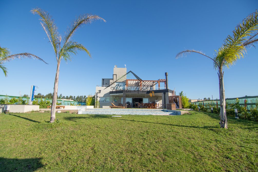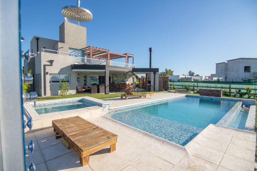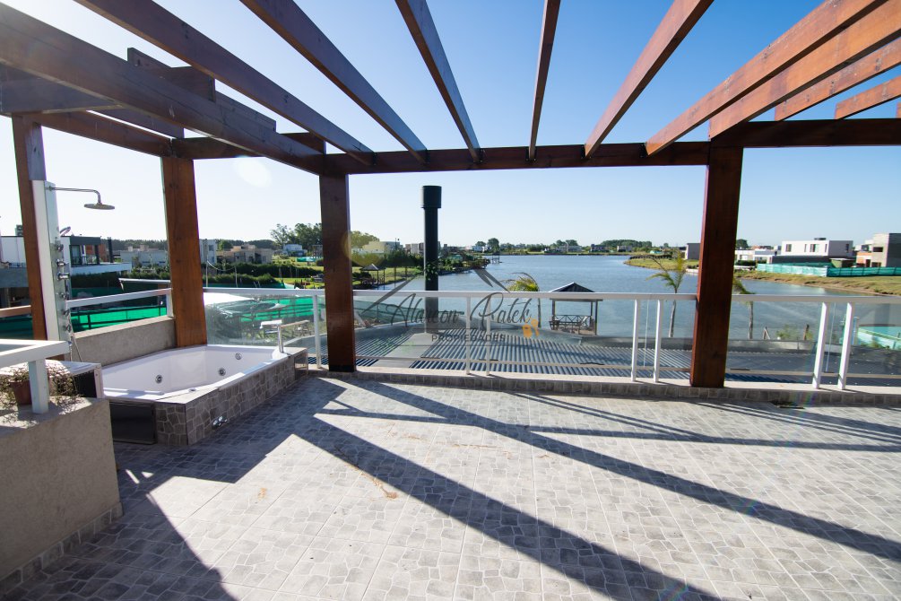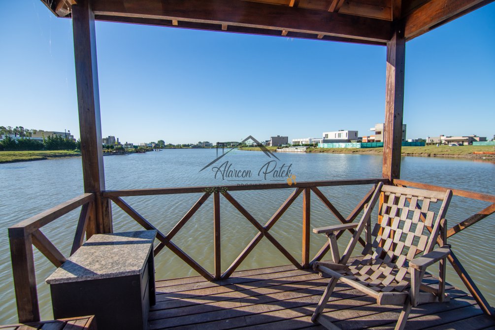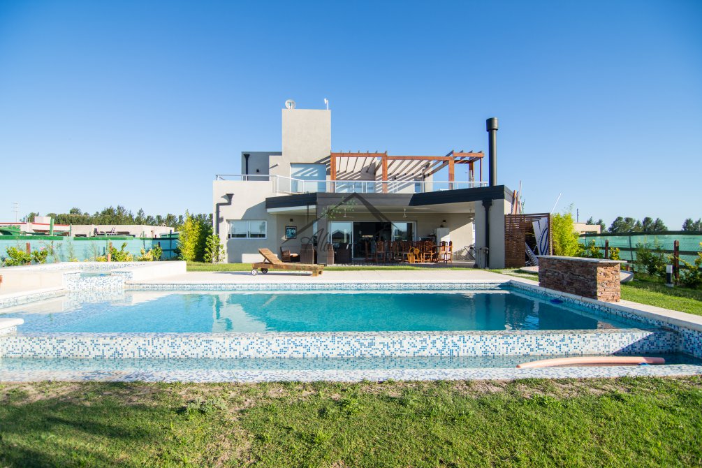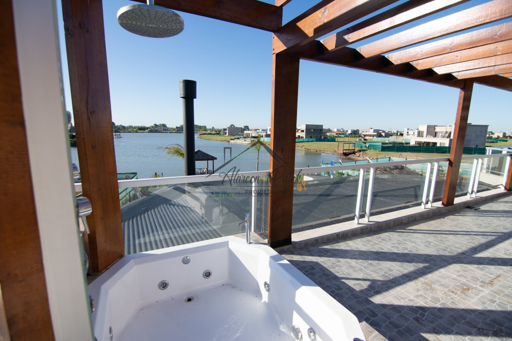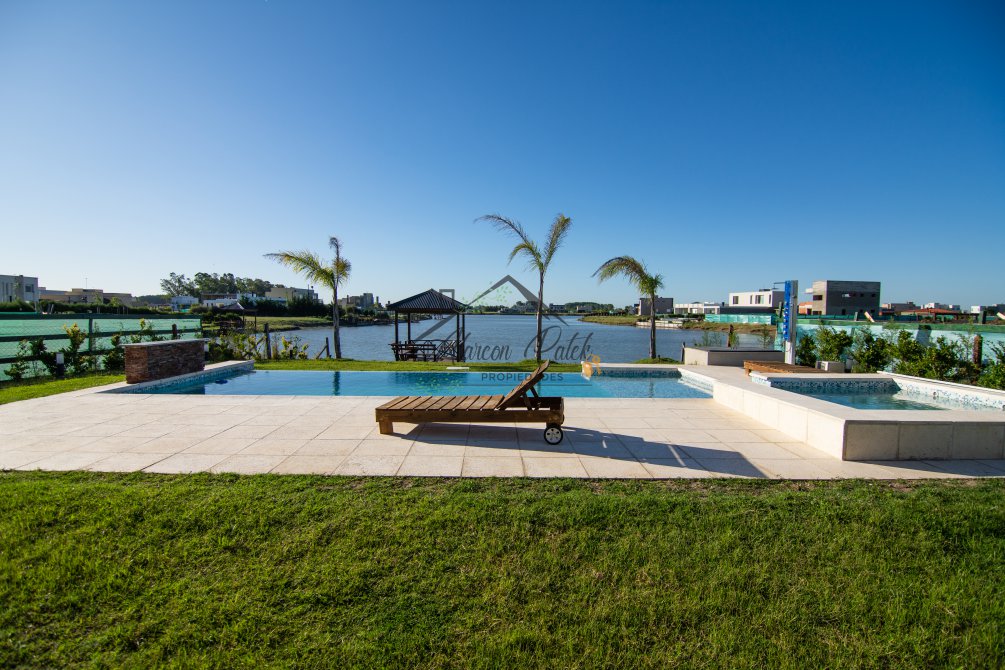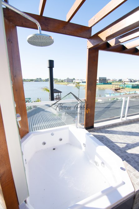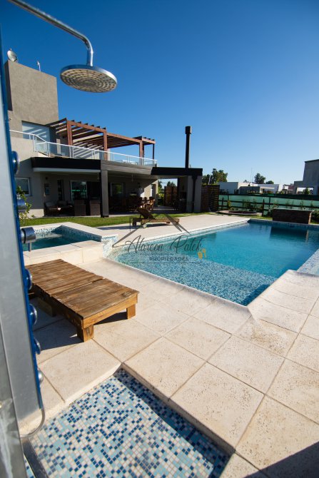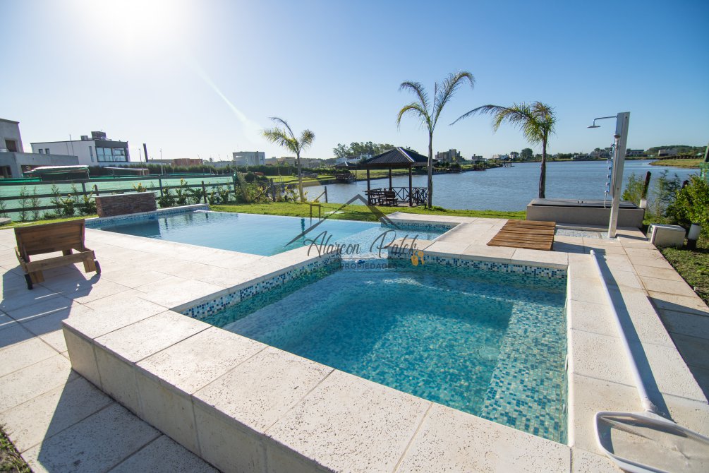 Hermosa propiedad emplazada en exclusivo lote con orientacion Noroeste. Esta propiedad se encuentra distribuida en dos plantas. En la planta baja cuenta con amplia entrada vehicular, con espacio guarda coche para dos autos bajo techo. Rampa para estacionamiento de cortesia. Ingresando por el frente acceso por hall con placard de recepcion. Amplio living comedor cocina incorporados de concepto abierto. Detalles de hormigon visto. Dos dormitorios en PB con baño completo. Sector de escritorio, super luminoso apto para otro dormitorio. Segundo baño completo con antebaño, con doble circulacion interior y exterior para uso de piscina. Lavadero. Amplisima galeria, parrilla con frentes completos, bacha y barra de asistencia para parrilla. Sector de asador. Piscina con jacuzzi climatizado. Sector de ducha exterior. Hermoso muelle con bajada a la Laguna. En Planta alta hermosa suite con vestidor, antebaño, baño completo y jacuzzi. Amplia terraza con jacuzzi exterior. La propiedad cuenta con finisimos detalles de categoria, A/A frio calor en todos los ambientes, DVH, losa radiante, se encuentra parquizada y con vegetacion. Tiene riego por aspersion.