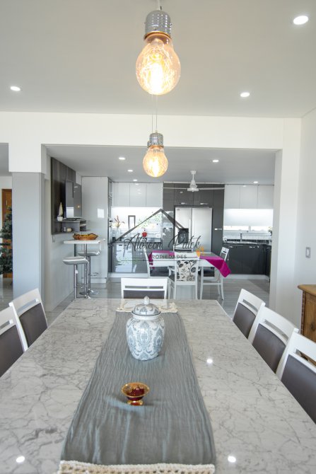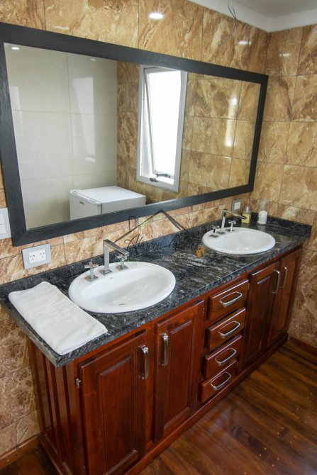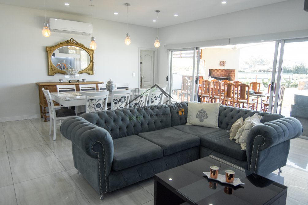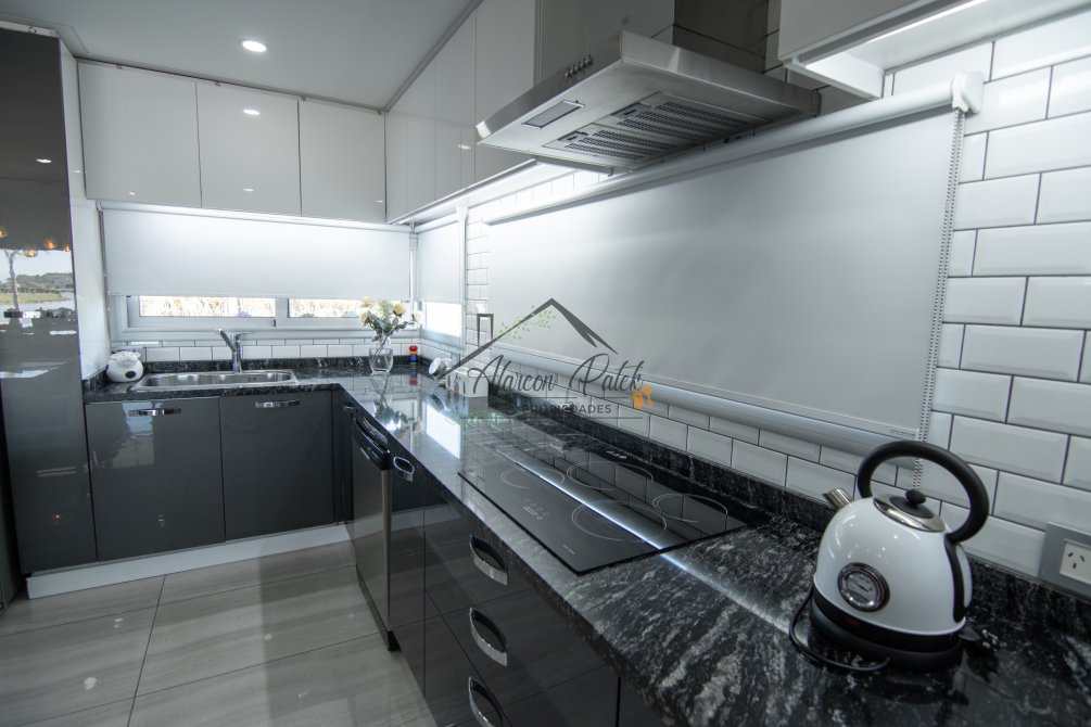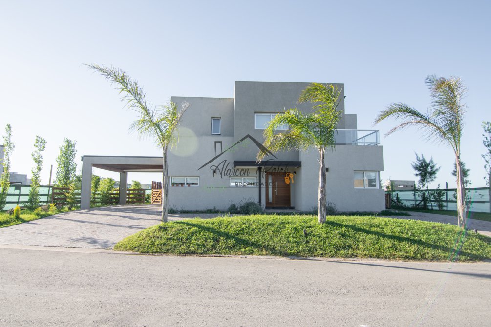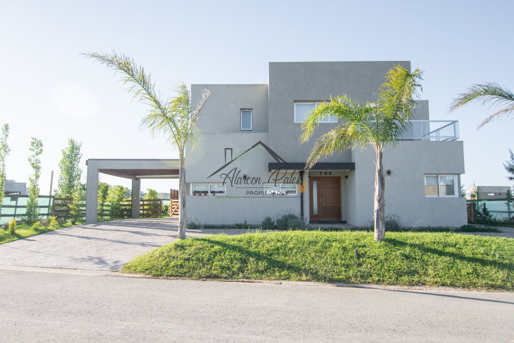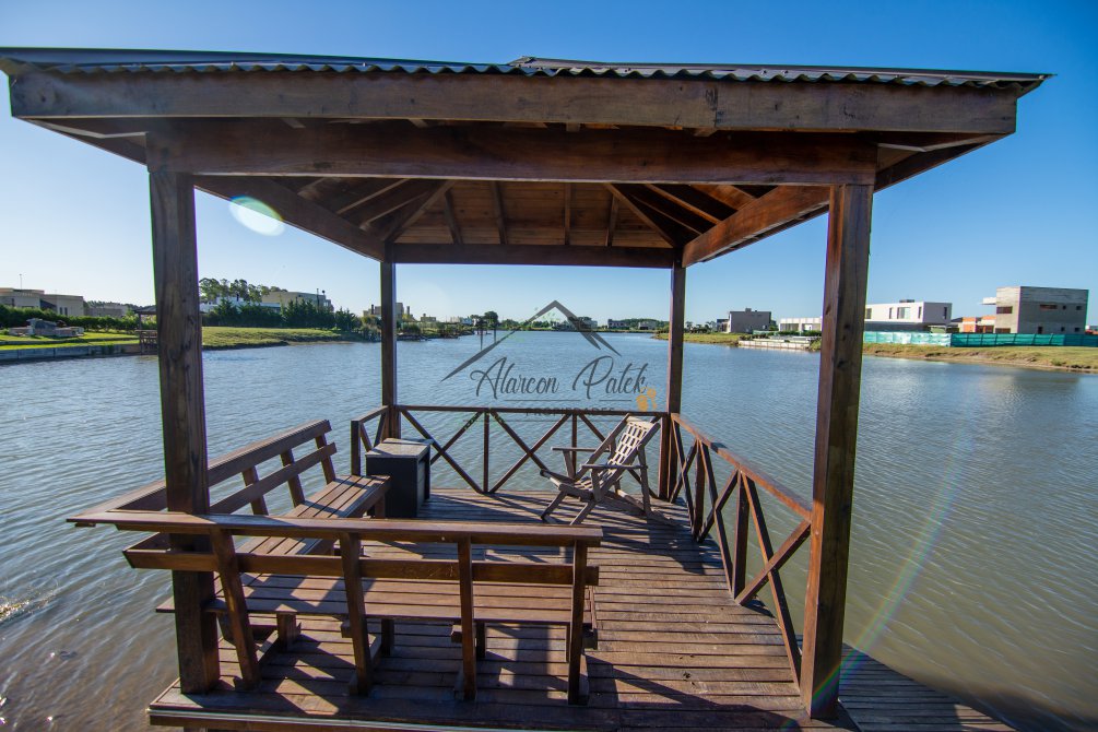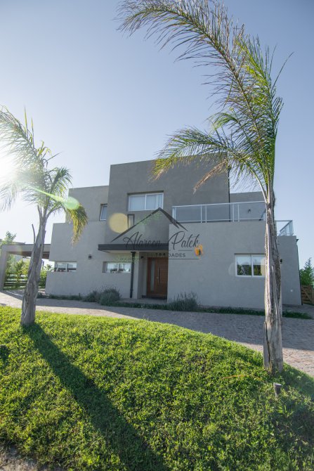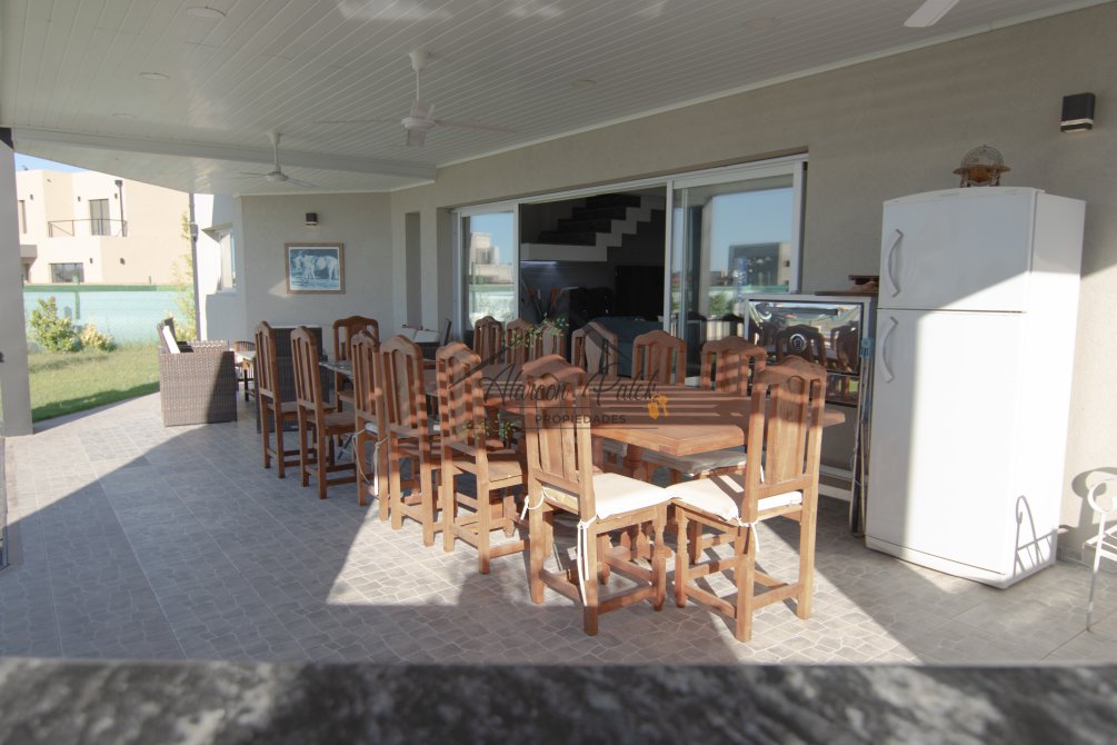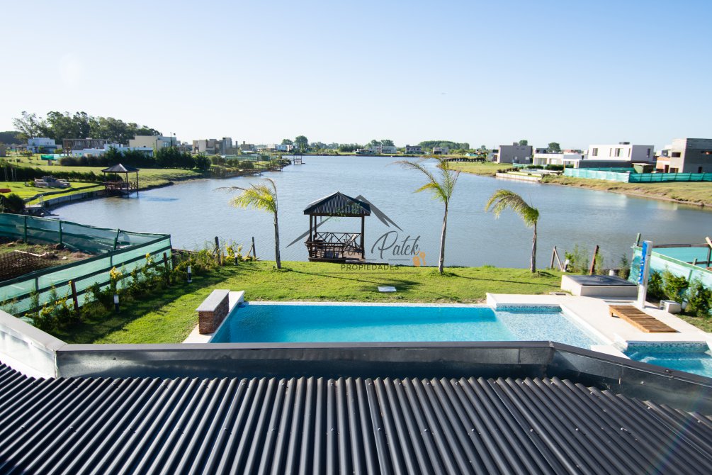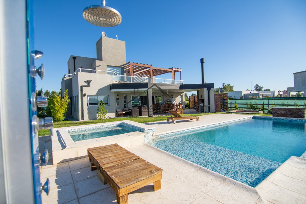 Hermosa propiedad emplazada en exclusivo lote con orientacion Noroeste. Esta propiedad se encuentra distribuida en dos plantas. En la planta baja cuenta con amplia entrada vehicular, con espacio guarda coche para dos autos bajo techo. Rampa para estacionamiento de cortesia. Ingresando por el frente acceso por hall con placard de recepcion. Amplio living comedor cocina incorporados de concepto abierto. Detalles de hormigon visto. Dos dormitorios en PB con baño completo. Sector de escritorio, super luminoso apto para otro dormitorio. Segundo baño completo con antebaño, con doble circulacion interior y exterior para uso de piscina. Lavadero. Amplisima galeria, parrilla con frentes completos, bacha y barra de asistencia para parrilla. Sector de asador. Piscina con jacuzzi climatizado. Sector de ducha exterior. Hermoso muelle con bajada a la Laguna. En Planta alta hermosa suite con vestidor, antebaño, baño completo y jacuzzi. Amplia terraza con jacuzzi exterior. La propiedad cuenta con finisimos detalles de categoria, A/A frio calor en todos los ambientes, DVH, losa radiante, se encuentra parquizada y con vegetacion. Tiene riego por aspersion.