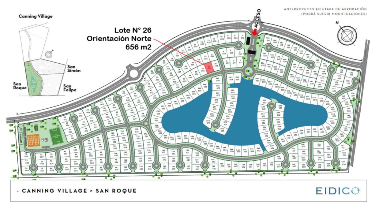- Lote N° 26 – Orientación Norte – 656 m2 – Interno con ligera vista hacia la laguna.