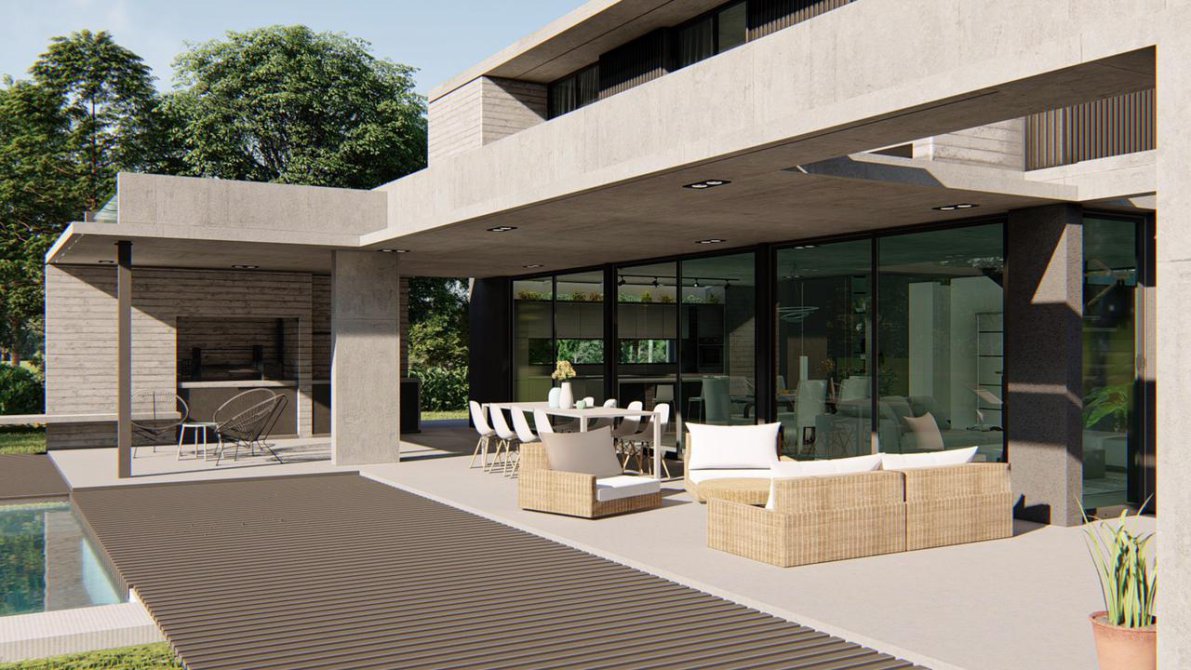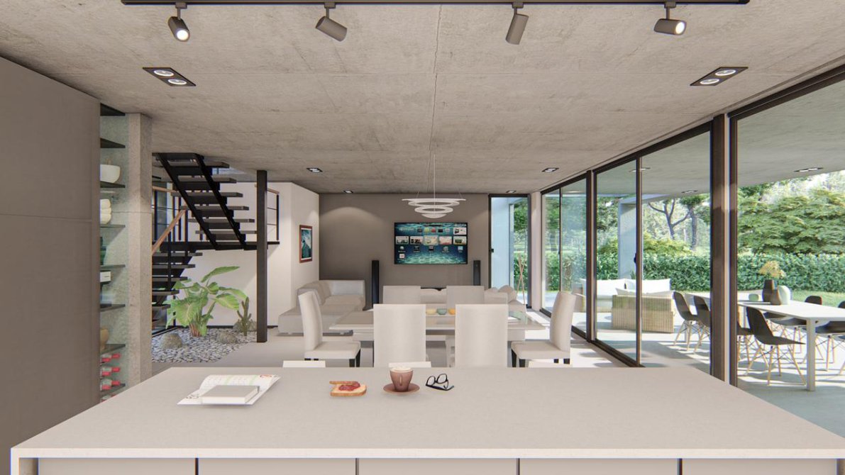 Losa de Hormigon visto Muros Interiores de material y textura a definir Solados en PB de hormigon llaneado o Porcelanato. Solados en Pa de Flotante vinilico a elección. Carpinterias piso a techo Aluar - DVH - A30 New - negro Iluminacion de embutir sectorizada