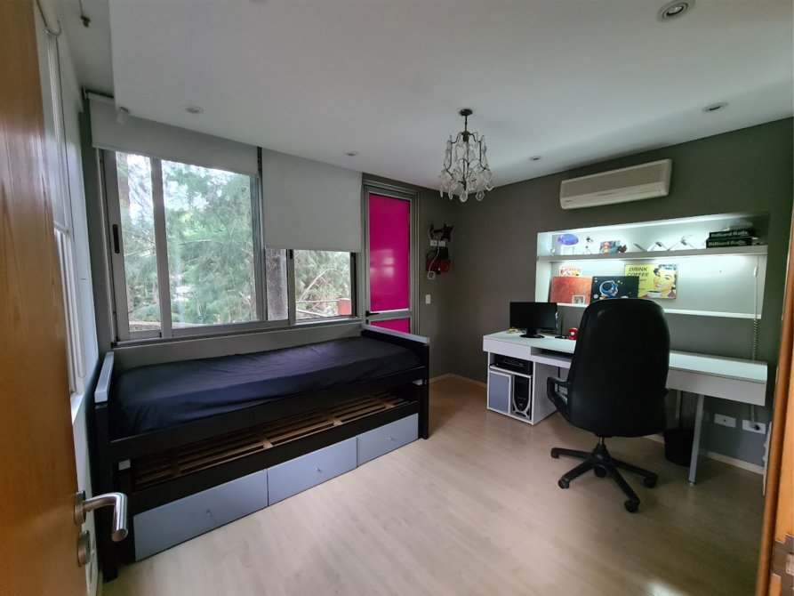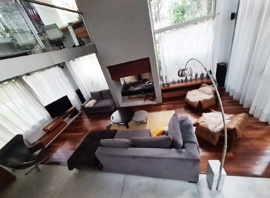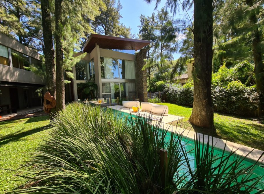 Planta Baja: Hall de recepción con placard. Living en doble altura con gran hogar a leña y vista al parque. Cocina totalmente equipada con Comedor diario integrado. Toilette, grifería Gessi italiana. Lavadero amplio con amoblamiento, termotanque y caldera. Quincho contiguo a cocina con Parrilla, mesada con bacha y guarda útiles Parque libre al fondo con riego automatizado. Piscina climatizada, revestida con venecitas aqua. Cercada. Pérgola lateral para dos autos.