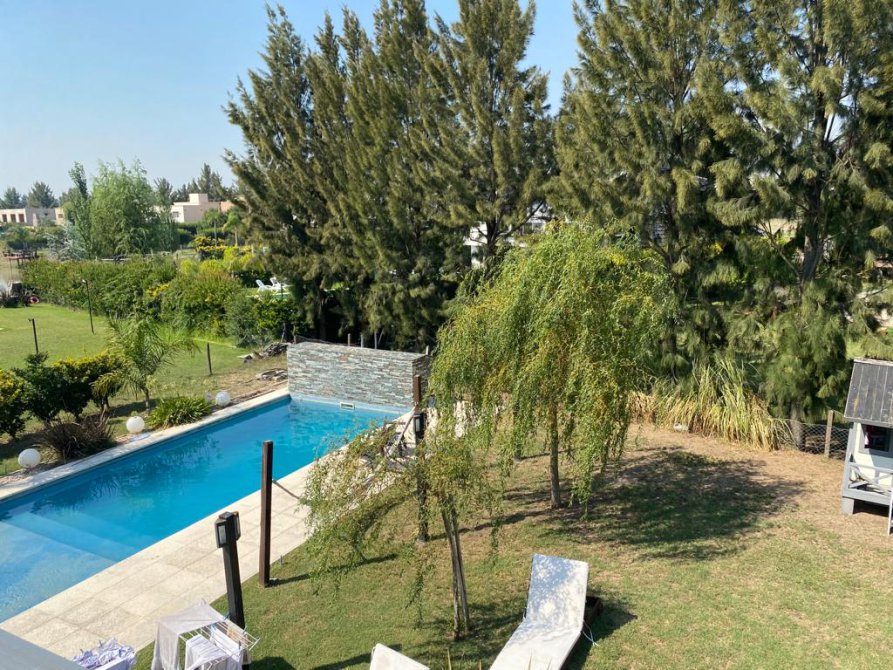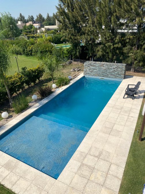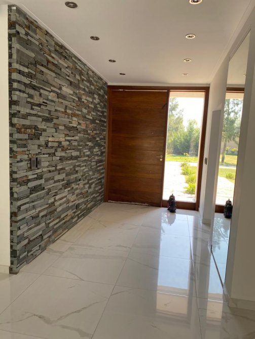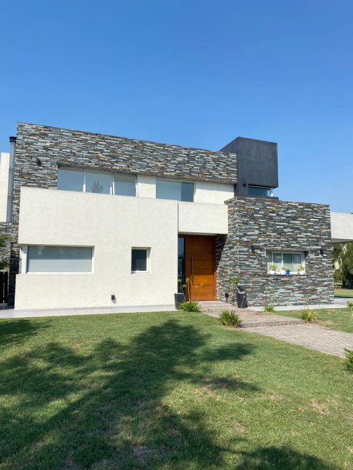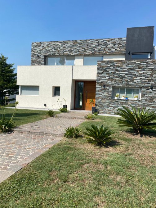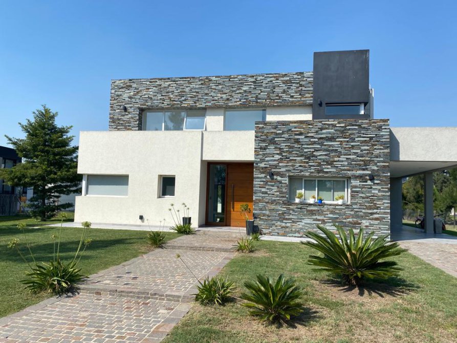 Moderna casa estilo actual con detalles en piedras, desarrollada en dos plantas, galeria con parrilla y pileta de 4 x 11 con playa humeda y cascada.