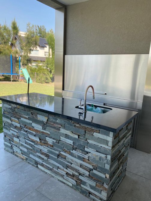 En la galeria cuenta con parrilla con frente de acero inxodable con mesada, bacha y horno a gas.