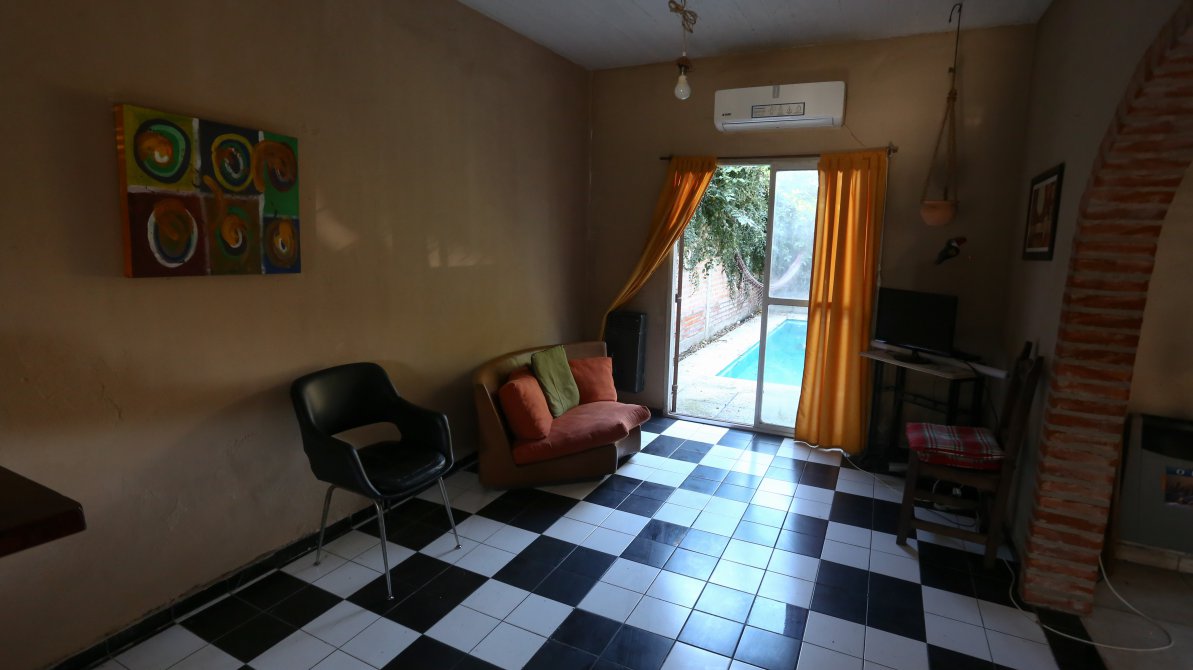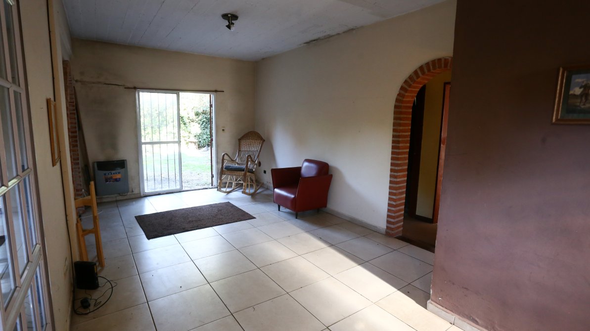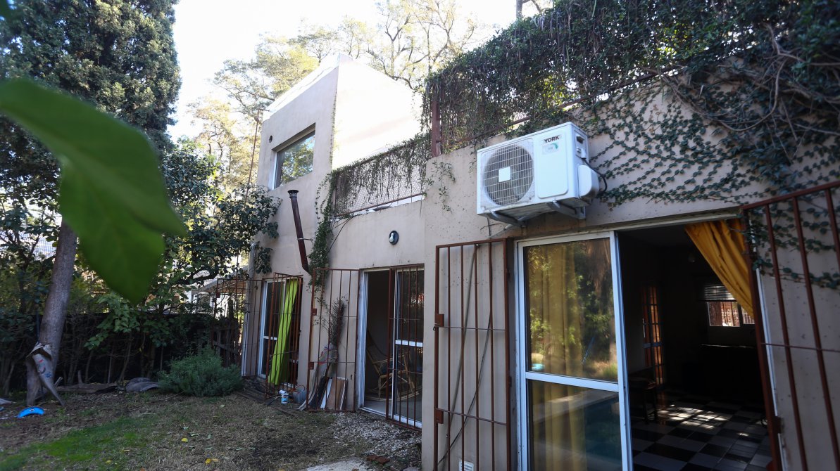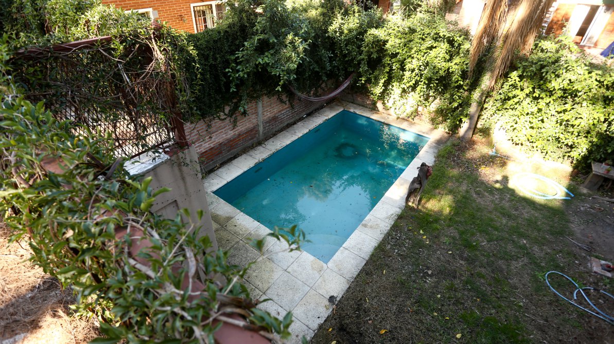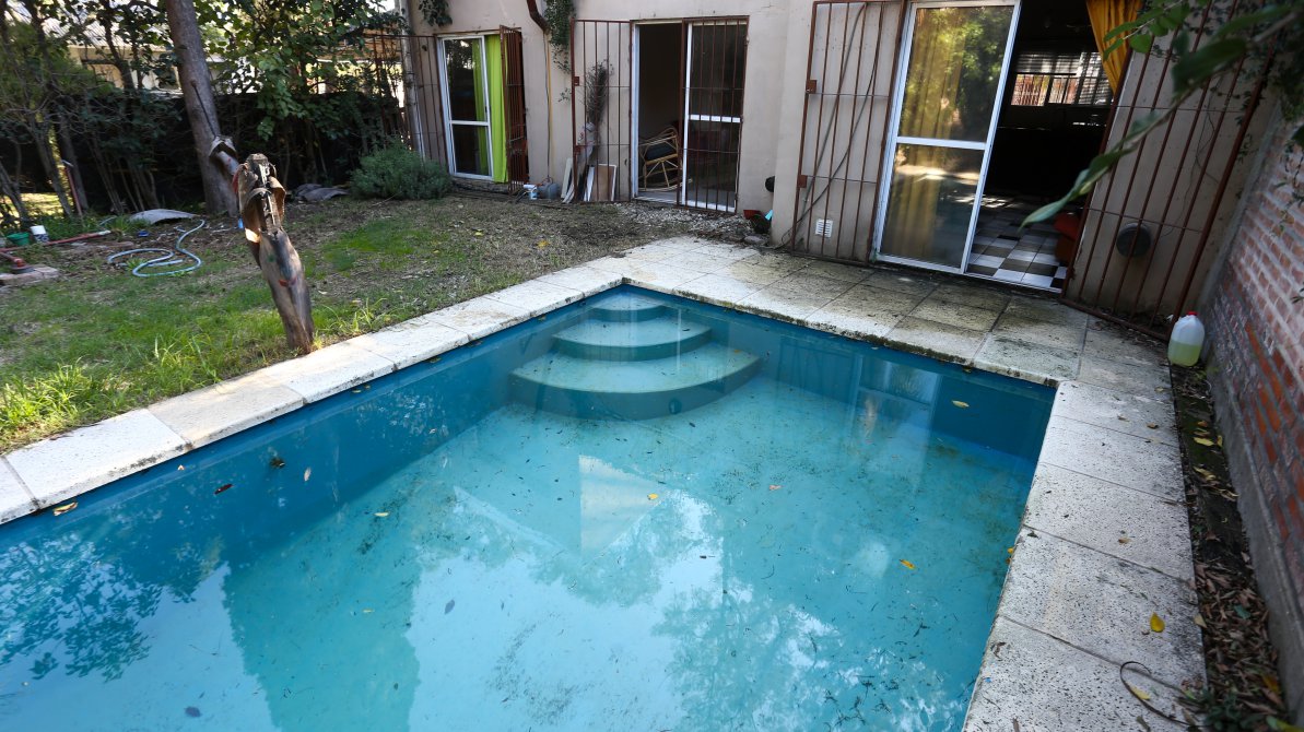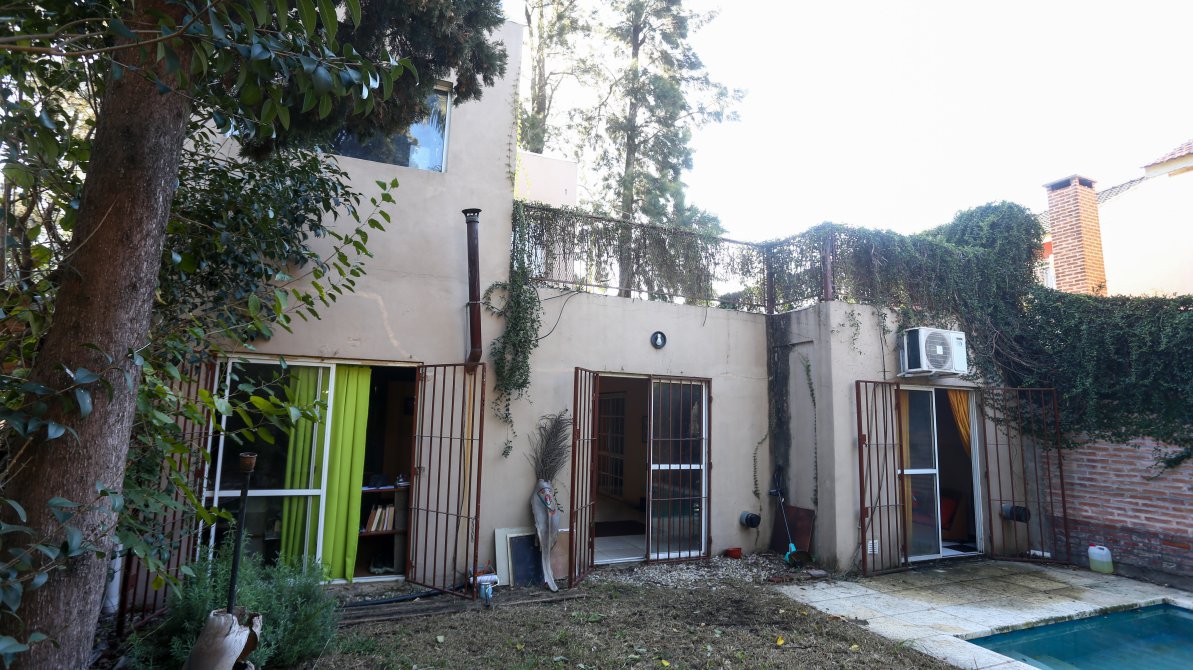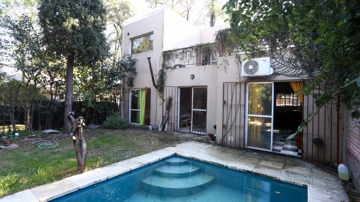 Fachada de gran y añeja arboleda con un espacio guarda coche. Acceso por el living integrado al comer cocina, ambos con salida al parque donde se encuentra la piscina de hormigón y espacio verde.