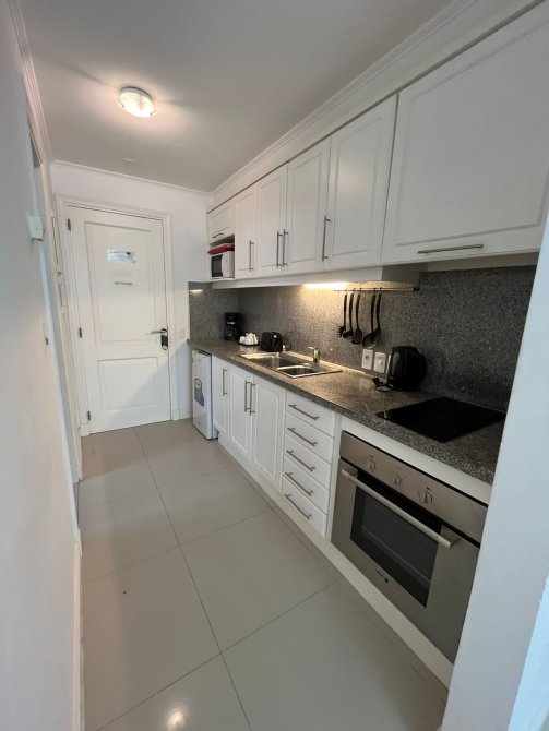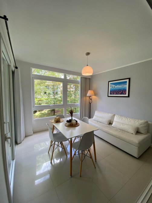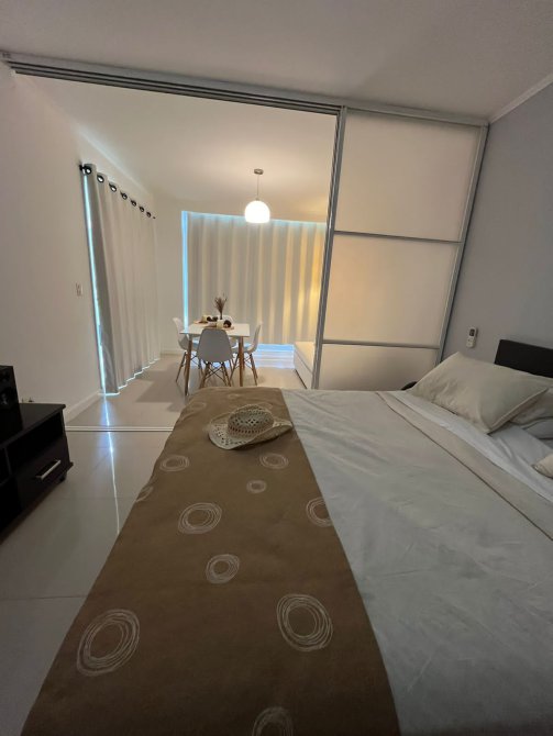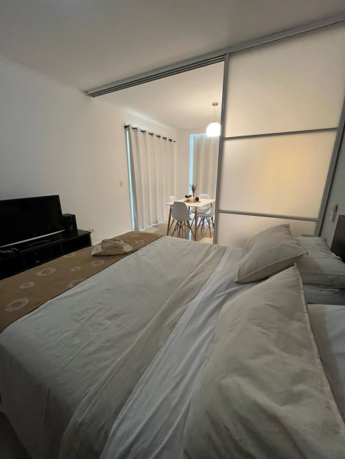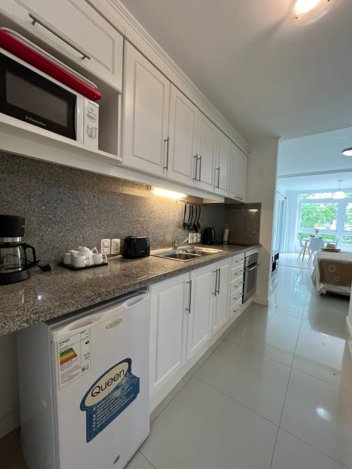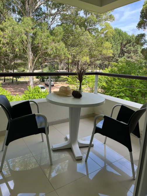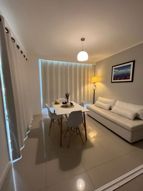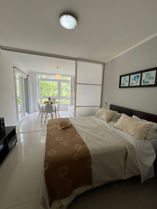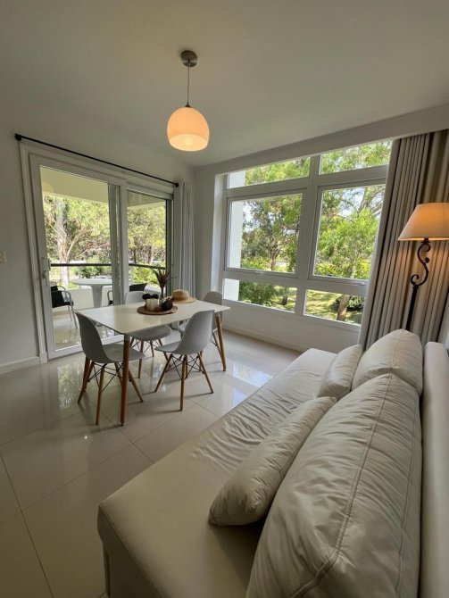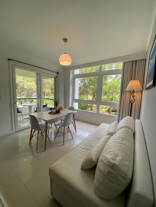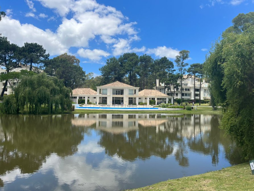 El departamento es un Monoambiente de lujo con una cama king size, sofa cama de una plaza más una cama adicional bajo el mismo. Está totalmente equipado con anafe, horno eléctrico y microondas, cafetera, licuadora, tostadora, ollas y sartenes, vajilla completa para 4 personas, aire acondicionado frio-calor, wi-fi y TV por cable incluido, servicio de hotelería, ropa de cama y baño, limpieza diaria, acceso a los club house que tienen sauna, jacuzzi, piletas de agua fria y caliente, gimnasio. Posee una terraza balcón con hermosa vista al bosque y lateral al lago.Tiene incluida una cochera para un vehículo de uso exclusivo.