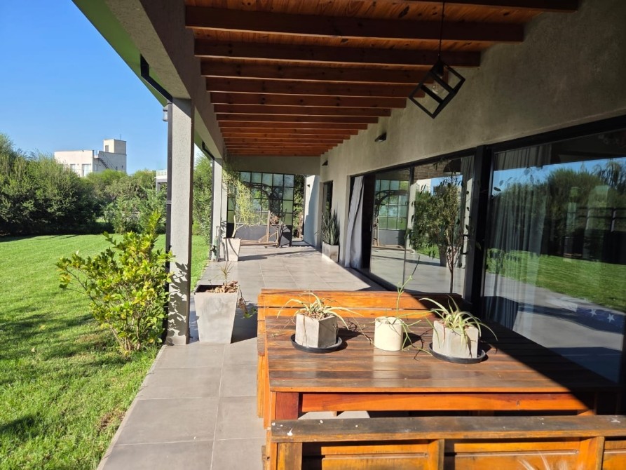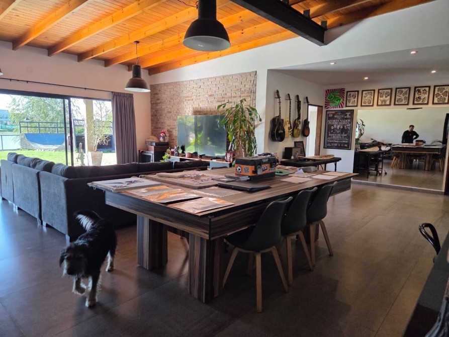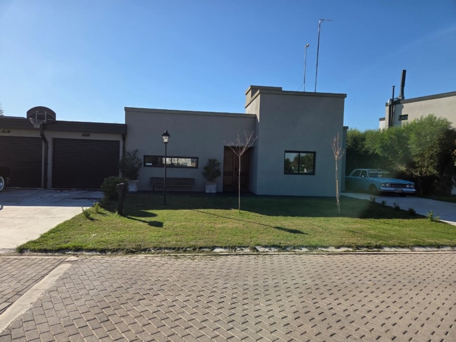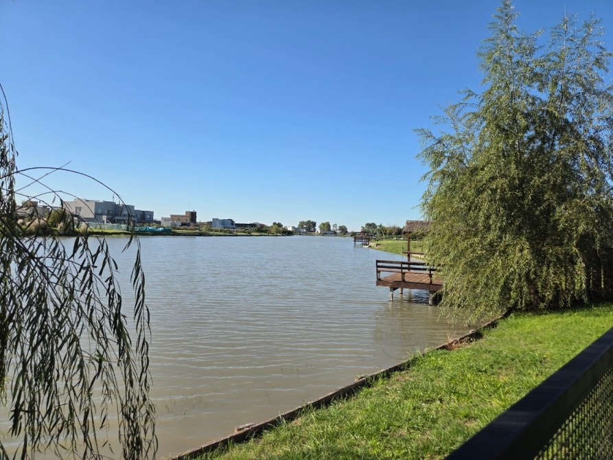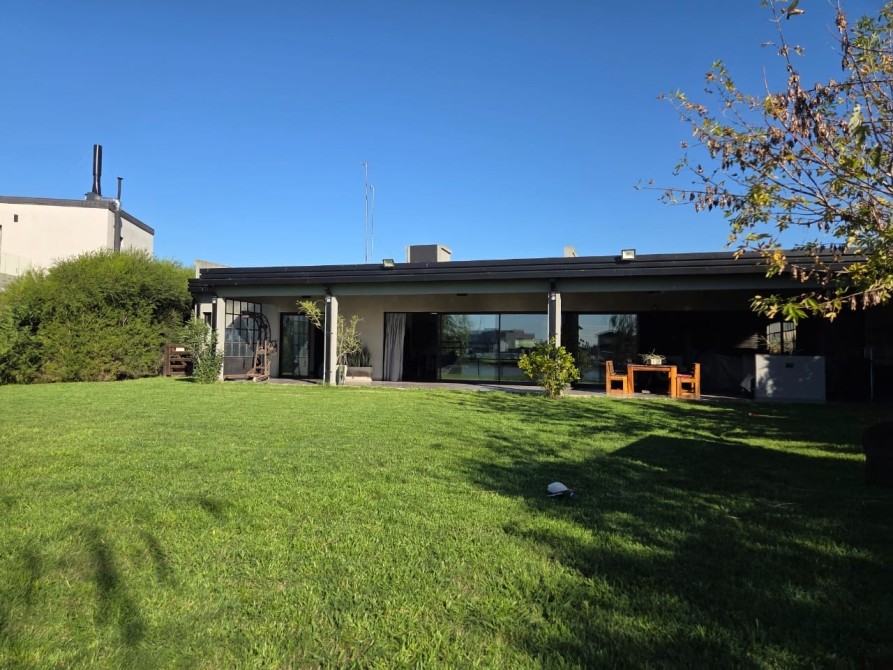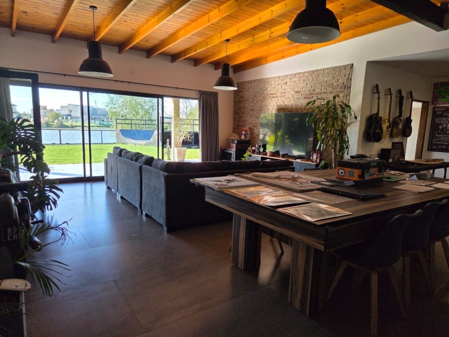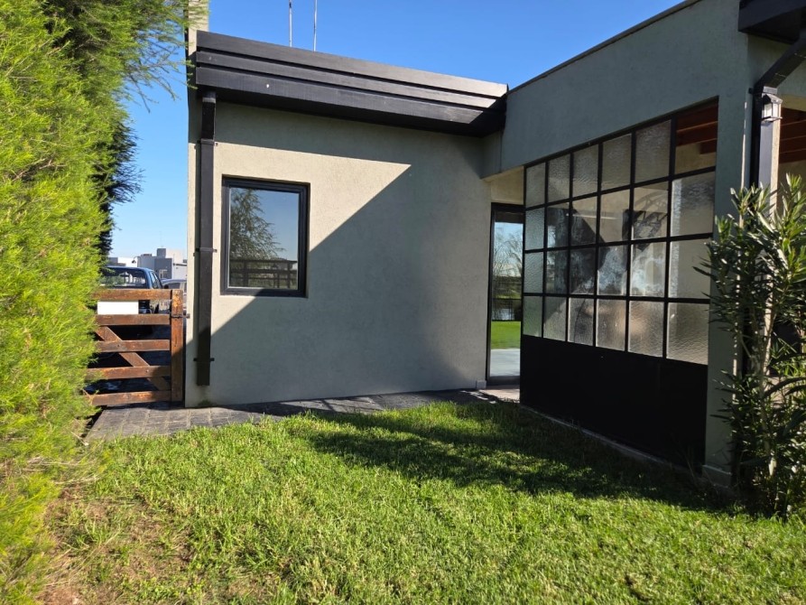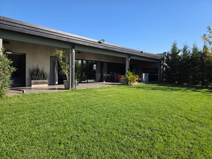 Club de Campo Horizontes al sur casa moderna en una planta con fondo a la laguna. Ingresando living comedor, cocina integrada de concepto abierto. Equipo de a/a frio calor. La casa es totalmente electrica. Asador a gas. Termotanque electrico/ solar. Baño completo con ducha para el aerea social. Dormitorio principal en suite con vestidor. Dormitorio secundario. Garage cubierto con toilete. Galeria con parrilla. Hermoso parque, parquizacion. Cerco vivo. Techo de chapa. Pisos de porcelanato. Aberturas DVH.