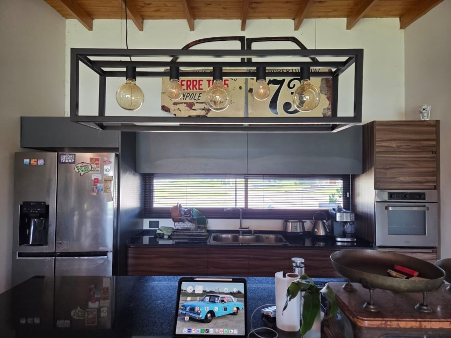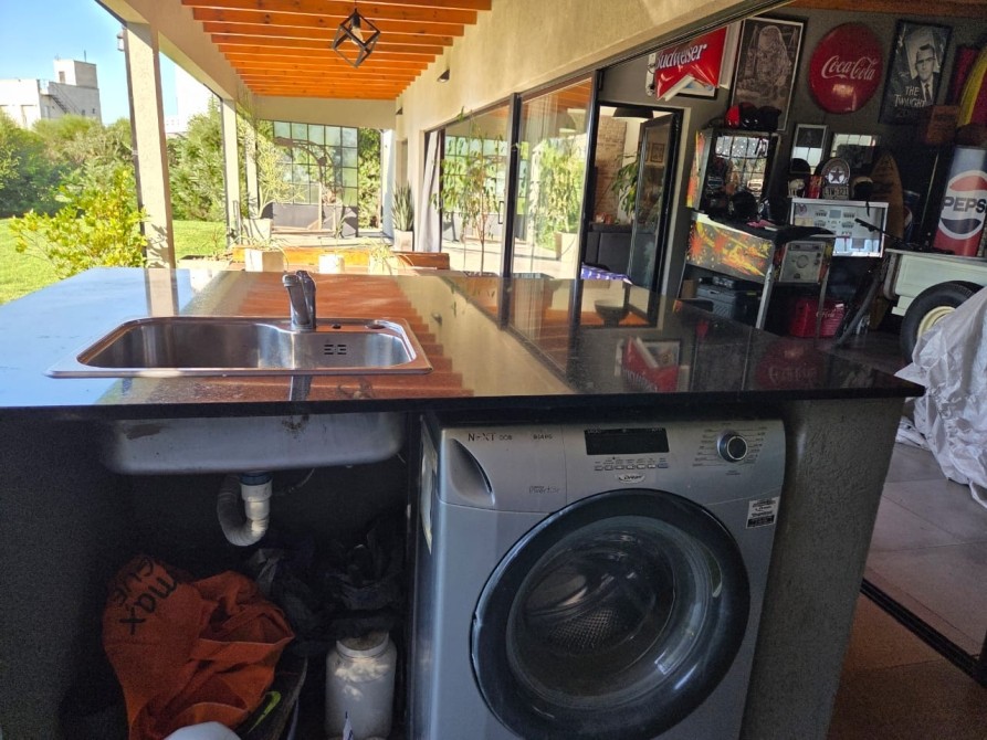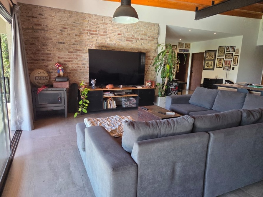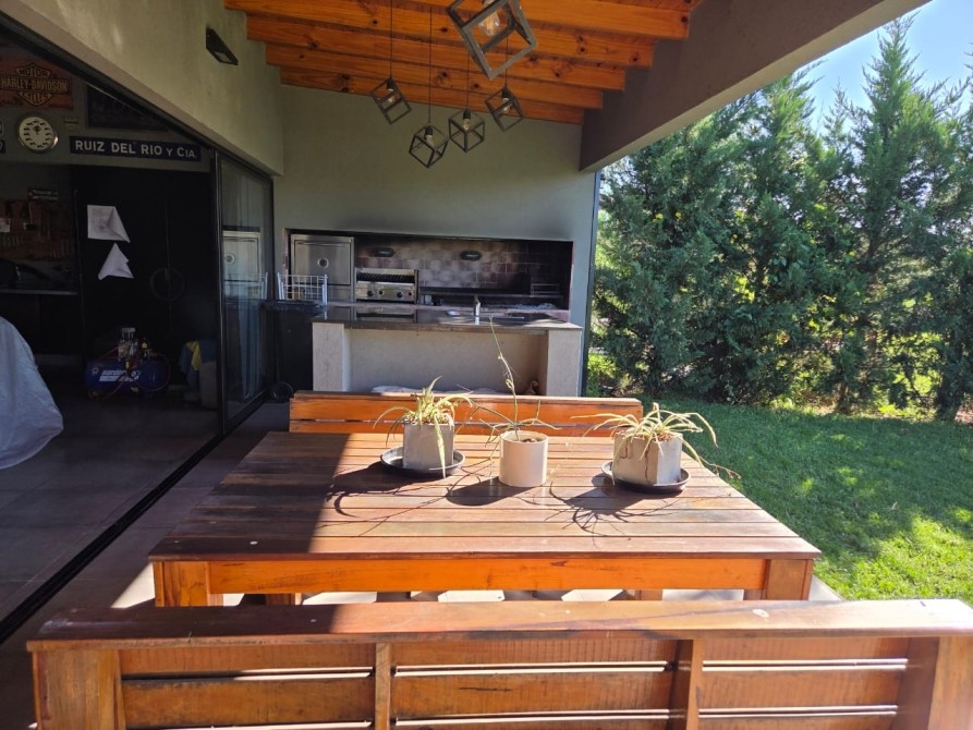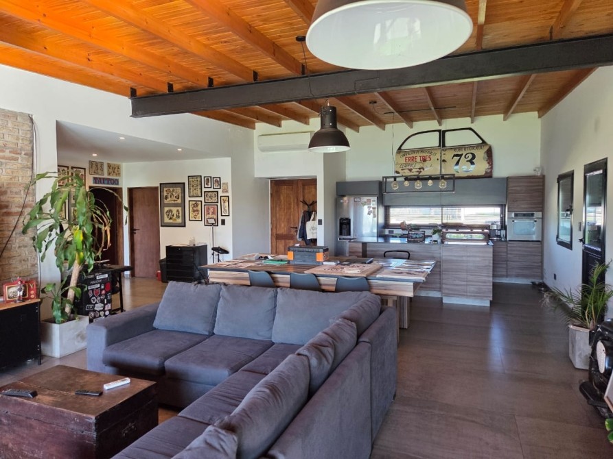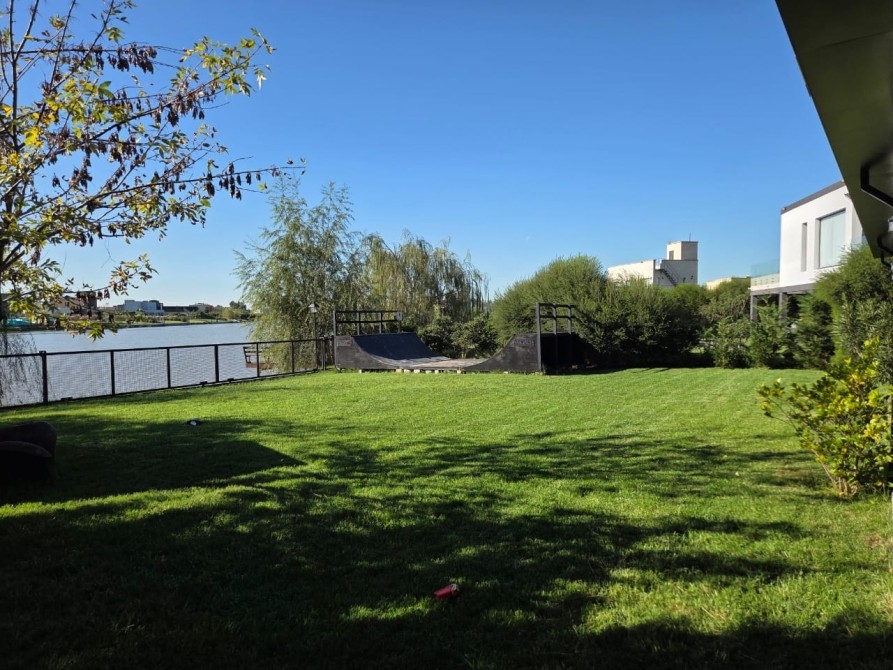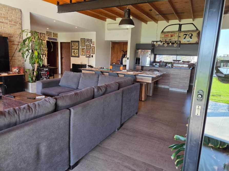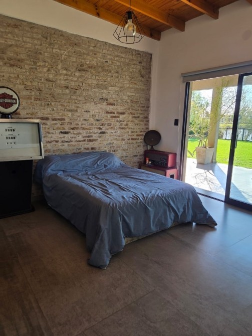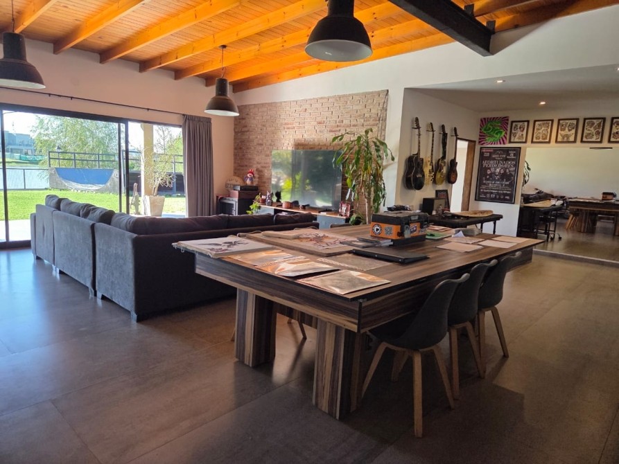 Club de Campo Horizontes al sur casa moderna en una planta con fondo a la laguna. Ingresando living comedor, cocina integrada de concepto abierto. Equipo de a/a frio calor. La casa es totalmente electrica. Asador a gas. Termotanque electrico/ solar. Baño completo con ducha para el aerea social. Dormitorio principal en suite con vestidor. Dormitorio secundario. Garage cubierto con toilete. Galeria con parrilla. Hermoso parque, parquizacion. Cerco vivo. Techo de chapa. Pisos de porcelanato. Aberturas DVH.